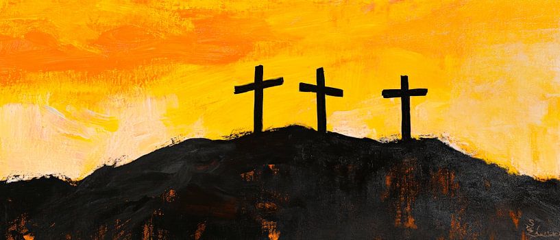 In a warm, golden sunset, three cross-shaped silhouettes rise majestically on a gentle hill. This powerful depiction of hope and faith radiates calm and reflection. Perfect for the living room or a spiritual space, it invites reflection and inner contemplation.
