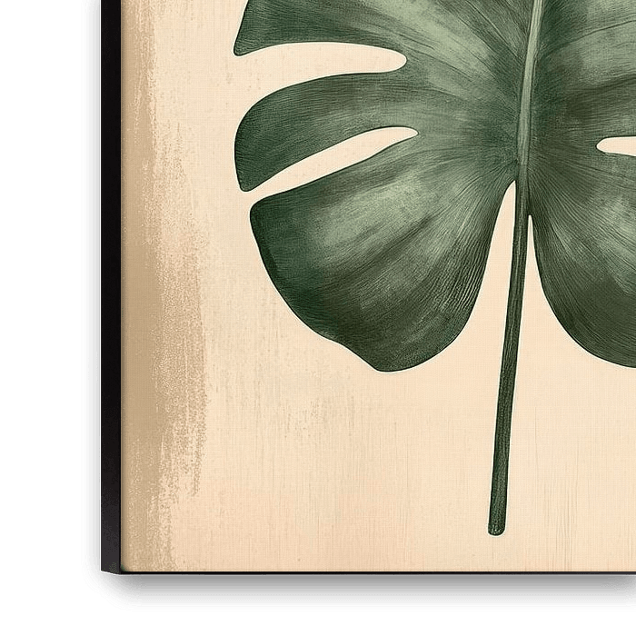 Three majestic leaves unfold their beauty against a soft, neutral background. The harmonious colour palette of lush green and warm earth tones lends any room a fresh, inviting atmosphere. Ideal for the living room or kitchen, this artwork brings the calming energy of nature right into your home.