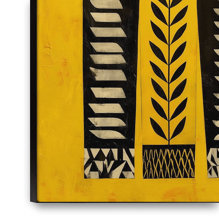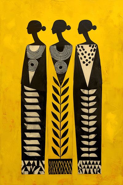 This expressive artwork depicts three stylised figures in a modern, graphic style against a bright golden yellow background. The clear silhouettes are complemented by decorative patterns and geometric shapes that lend the image rhythm and cultural depth. The reduced colour palette and strong design create a contemporary, elegant effect,…