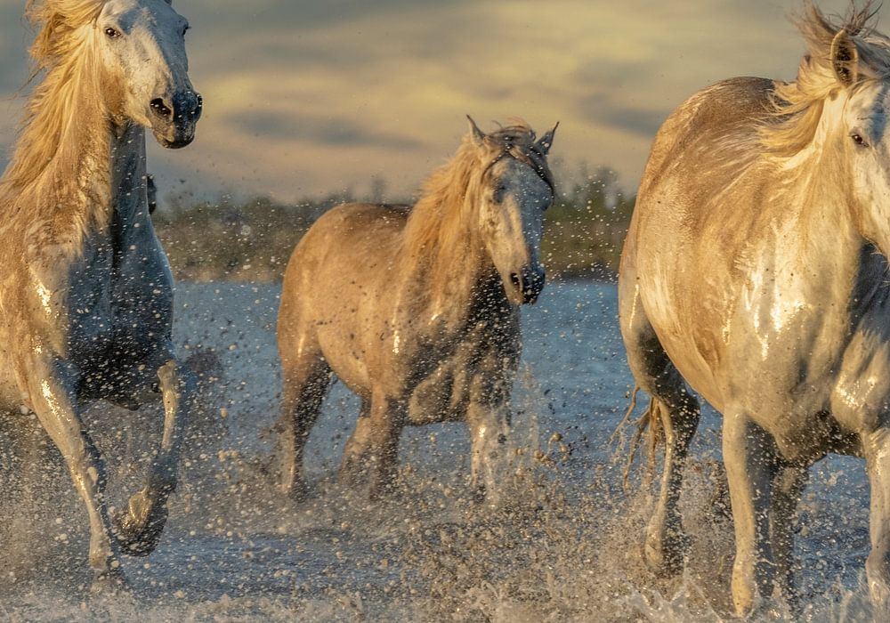 Camargue horses running through water. Camargue horses are the only horses strong enough to run through muddy salt water that is part of lakes from the sea. This is late evening. The sun is almost gone.