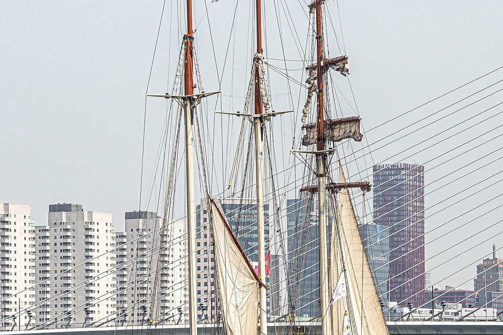 Historic Driemaster in front of Rotterdam's Erasmus Bridge and the port city skyline in the background.