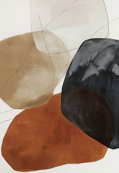 hushed encounter between forms, as if earthly elements just touch but retain their own space. Large, organic surfaces in rusty brown, deep black, sand and beige lie like stones on a white canvas, connected by thin, playful lines that dance across the picture surface like hairlines or cracks. The use of colour evokes a sense of…
