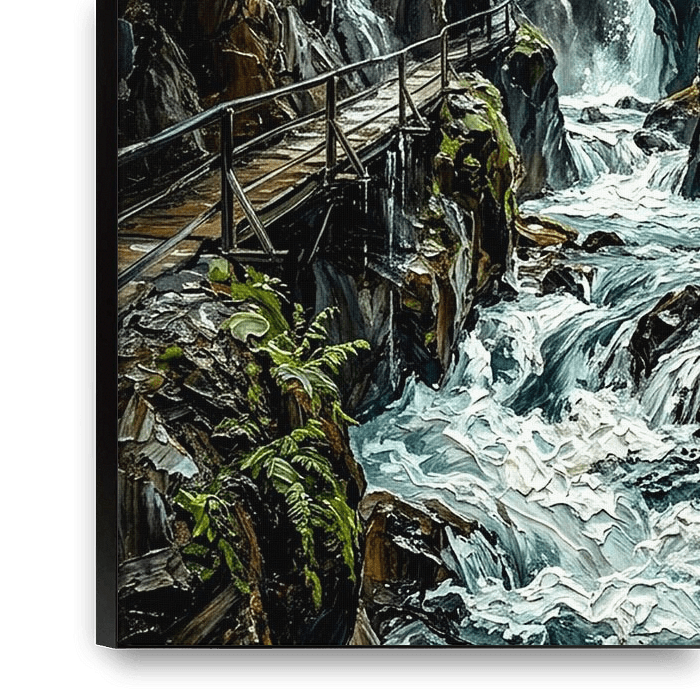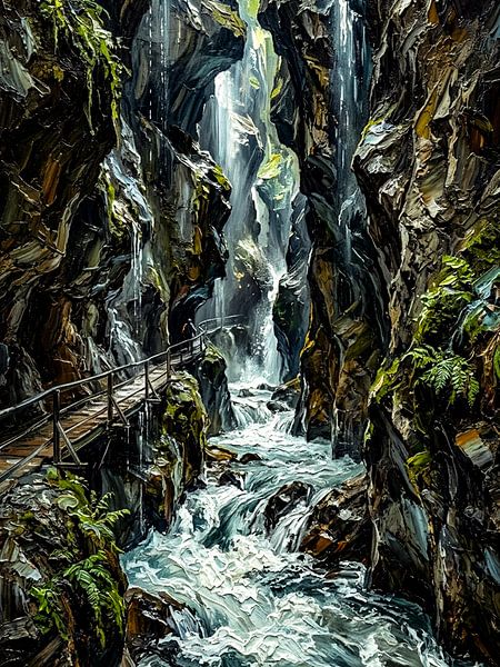 Inspired by Partnach Gorge, this impasto painting reveals a hidden canyon carved by rushing water. Heavy textures and dramatic light bring the raw force of nature to life, evoking depth, movement, and an immersive sense of isolation.