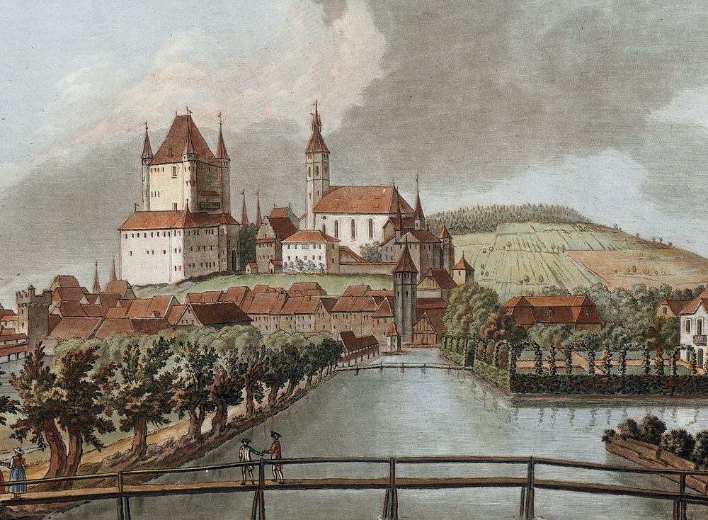 Thun, from the south; Colour copper engraving by Atelier Liesjes