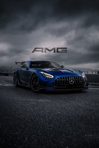 The Mercedes-AMG GT Black Series dominates a gloomy track under storm clouds. Its aggressive stance and deep blue finish exude raw power and dark elegance.
