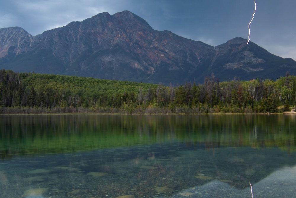 This image was taken near Jasper, Alberta, Canada. The planned hike was out of the question due to the arrival of a heavy thunderstorm. On the way, however, there was still a viewpoint by the water. The heavy thunderstorm over the mountains in the distance made for spectacular images that reflected very well in the still, clear water. This, of course, had to be photographed. After endless attempts, we managed to capture a thunderclap in the mountains.