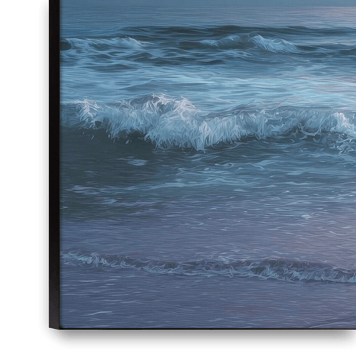 This seascape depicts the coast at a moment of transition, when the light grows warmer and the day slowly dissolves into silence. Waves break gently on the beach, leaving behind foam and reflections that mirror the pastel light of the sky. Blue, pink and greyish tones flow into one another, giving the image a calm, almost painterly…