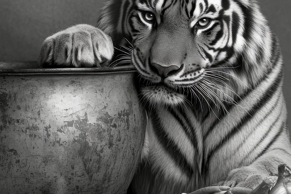 A majestic tiger leaning casually against an old cooking pot lends this picture a fascinating, mystical atmosphere. The monochrome design and the hint of wildness create a strong contrast that will spark interest. Ideal for an elegant kitchen or a modern living room where it can stimulate conversation.