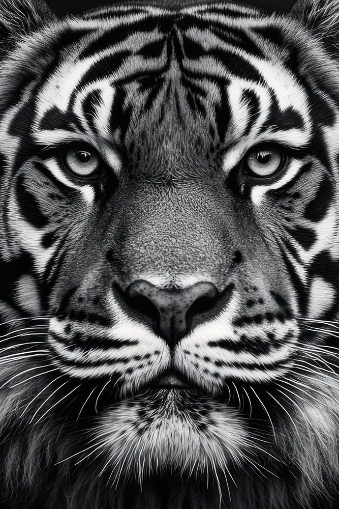 A majestic tiger whose penetrating gaze and detailed fur pattern in black and white attract everyone's attention. This powerful depiction embodies both strength and elegance and adds an exciting atmosphere to any room. Ideal for a stylish living room or creative office to encourage inspiration and courage.