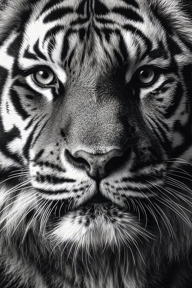 A majestic tiger with a penetrating gaze and powerful facial features. The meticulous detail of the striking stripes and expressive mane exude strength and grace. This impressive work of art is perfect for the living room, where it will stimulate conversation and add a touch of the wild.