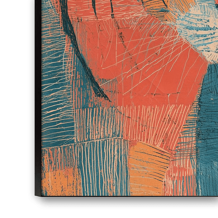 A modern ode to wild grace — the tiger emerges from a mosaic of bold orange and deep teal, its quiet strength drawn in layered textures and etched lines that breathe both calm and fire