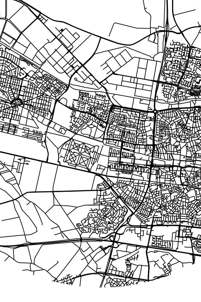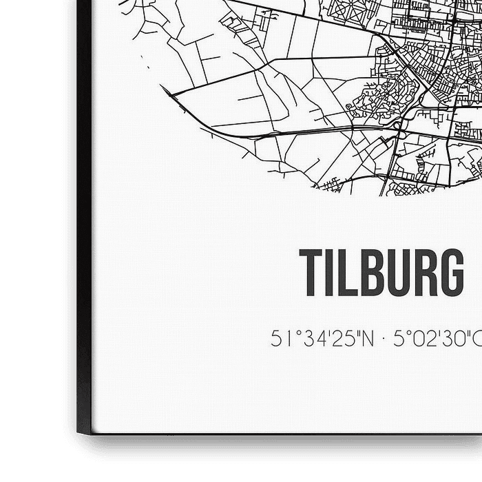 Black and white map, street map or street plan of Tilburg. Tilburg is located in the municipality of Tilburg, province of North Brabant. On the city map all public roads in Tilburg are included. Furthermore, the map is provided with the coordinates of the center of Tilburg.