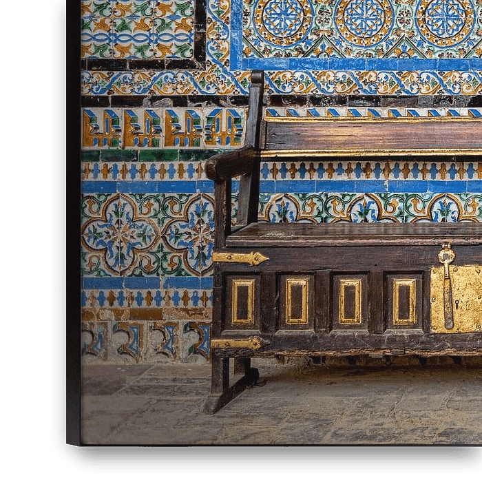 Buy the photo Tiled wall with antique bench in Casa de Pilatos by Alexander Baumann on canvas, ArtFrame, poster and wallpaper, printed on demand in high quality.