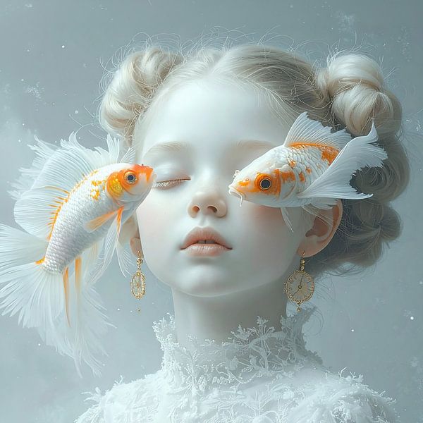 A dreamy portrait of a beautiful young girl, with skin almost as delicate as porcelain and blonde hair, her eyes closed and bells dangling from her ears. She has a serene, peaceful expression, innocent and pure. The bells in her ears symbolise the time for dreaming, a magical moment. The goldfish floating around her head symbolise her…