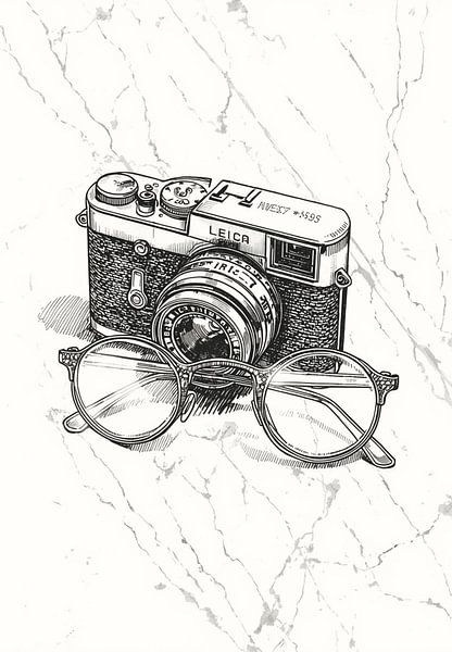 An elegant still life created using detailed graphic illustration techniques. The combination of the legendary Leica camera and vintage glasses symbolizes a passion for art, photography, and history. The drawing is harmoniously integrated into the noble texture of white marble, giving the work a monumental and premium look. Perfect for…