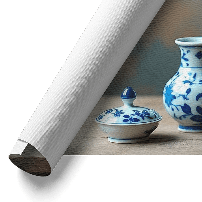 This stunning still life exudes timeless beauty and sophistication. Three hand-painted Delft blue vases, each unique in shape and design, are arranged gracefully on a rustic wooden table. The vases are filled with delicate white flowers, whose natural charm contrasts harmoniously with the detailed blue patterns of the ceramics. The…