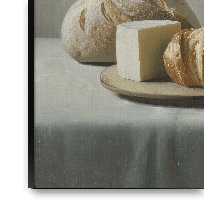 Timeless Feast - This still life painting shows a carefully arranged table with bread, cheese, fruit, and ceramics, bathed in soft, natural light, evoking a sense of peaceful domesticity.