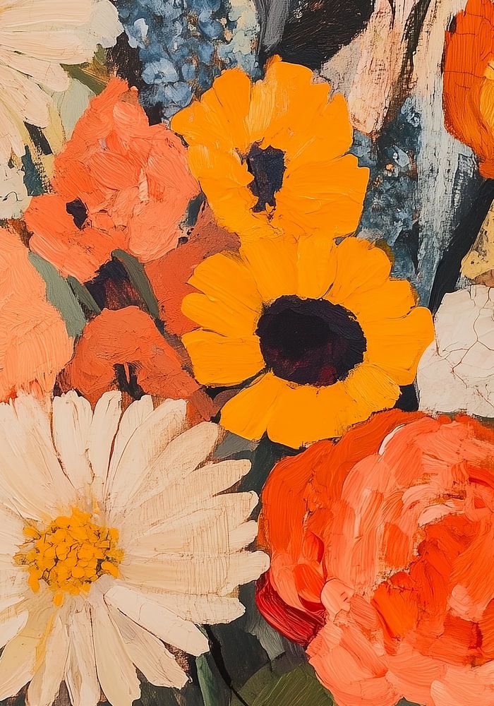 Een Tijdloze Mix van Kleuren en Texturen presenteert een verfijnd en levendig stilleven waarin een peachkleurige vaas centraal staat, vol met een weelderig boeket van kleurrijke bloemen en besjes. De vaas rust op een tafel die baadt in warme aardetinten, waardoor een natuurlijke, rustgevende basis wordt gelegd voor de explosie van kleuren die erboven te zien is. In dit schilderij trekken verschillende bloemen de aandacht: een grote, stralende zonnebloem vormt het middelpunt, haar gouden bloemblaadjes vangen het licht en geven een zonovergoten indruk. Rondom deze zonnebloem groeien delicate witte madeliefjes, zachte roze rozen, en een verzameling van levendige gele en oranje bloemen, elk met hun eigen textuur en vorm.
