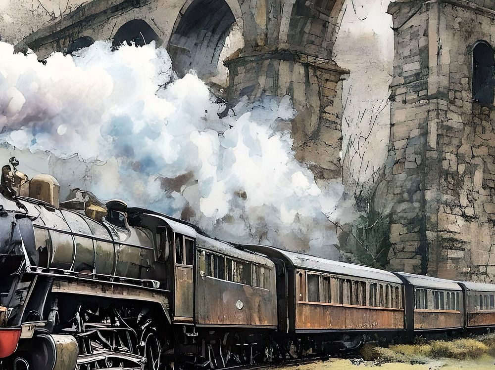 The detailed ink painting technique brings to life both the robust texture of the stone bridge and the delicate details of the steam train. The vibrant colours and the play of light and shadow give the painting a dynamic yet soothing atmosphere.