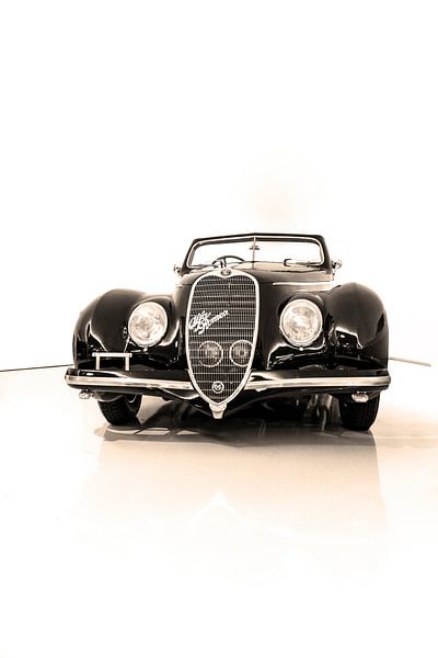 An iconic classic Alfa Romeo 6c 2500 sport in deep black, captured head-on against a minimalist background.