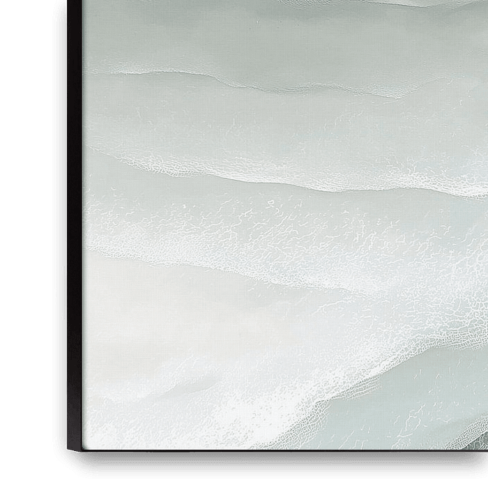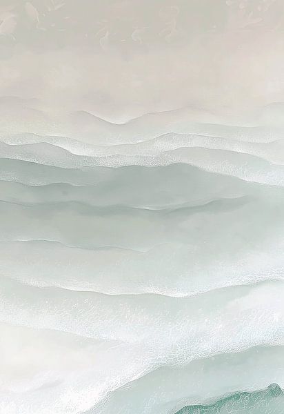 abstract landscape in which wavy lines gently blend together. The main colour is grey-green (colour), subtly complemented by white and nuances of jade and light beige. The layers flow harmoniously over each other, creating a sense of depth and stillness. As if looking at a misty coastline, where patches of fog obscure the view and blur…