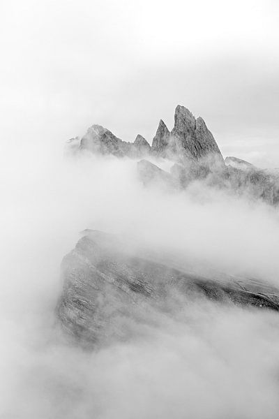 Seceda rises silently in the Dolomites, where clouds glide past sharp peaks.