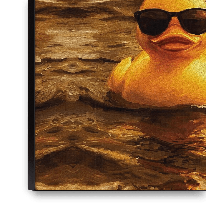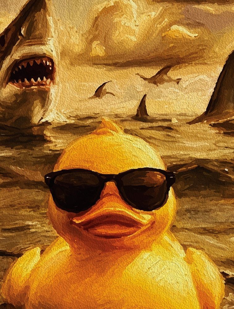 Story‑driven fantasy seascape where a tiny yellow duck confronts a sea filled with sharks, painted with expressive oil textures and glowing light. Created for fans of character‑based art, gaming culture, and epic yet humorous scenes.