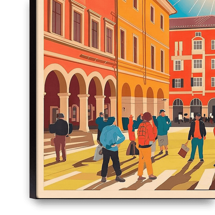 A bright sunshine bathes the lively scene in warm light as people in colourful clothes stroll along the street. The architectural splendour of the historic buildings in vibrant colours conveys a sense of joie de vivre and cultural heritage. Tirana, a place that harmoniously combines tradition and modernity, attracts everyone's attention.