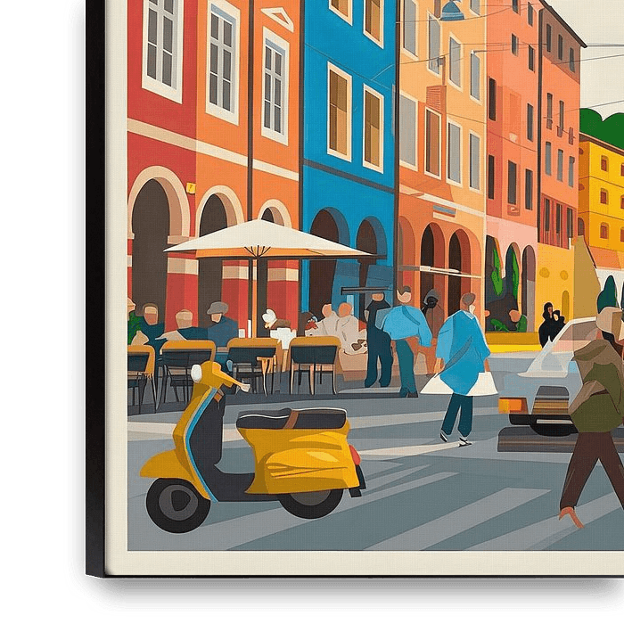 Vibrant colours dance across the façades of the colourful buildings, which exude a charming atmosphere. At the heart of the city stands the striking clock tower, which epitomises time and tradition. The lively street pulsates with the energy of passers-by and the sound of scooters, while cafés invite you to linger and the sun lights up…