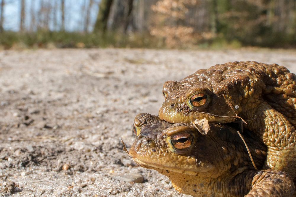 Every year at the end of the winter, toads wake up from their hibernation. These toads have just emerged from the foliage and are now moving towards a nearby pool. There, the first thing they do is mate. In this picture the male is already on the back of the female (that's called amplexus) and so it will be a tough trip for the female.