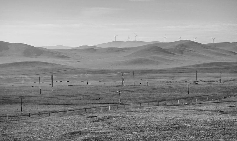 Black-and-white image of the endless hilly steppe in central Mongolia, with some wind turbines in the background.