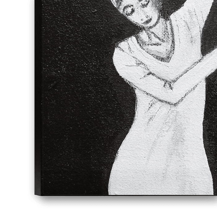 A minimalist work, a drawing/painting on canvas. The white thread gives the work movement & tension. Together' has a 'sister' and is a mirror image of this work. the contrasts and similarities make them together into a powerful whole.
