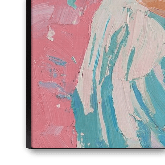Togetherness in Bright Colors - This painting shows a group of four women standing cosily together, with their arms wrapped around each other, with a background of soft shades of pink creating a cheerful and intimate atmosphere, while the bright colours of their clothing and the playful brushstrokes give it a modern feel.