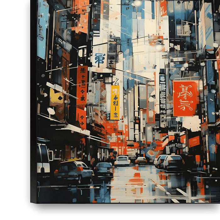A colourful, lively and abstract depiction of a Tokyo street. An impression of the chaotic beauty of this Japanese metropolis.