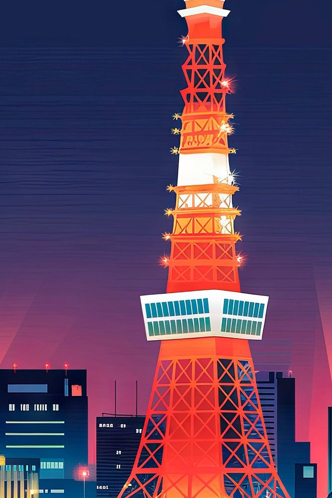 The iconic Tokyo Tower towers high in the midst of vibrant urban life. Its bright red colour sparkles in contrast to the soft lights of the city. The nocturnal backdrop and dramatic sky lend the scenario a vibrant energy that combines Japan's ceaseless progress and tradition. Tokyo awaits you!