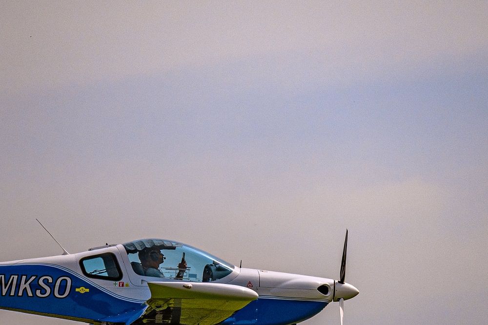 A blue and white single-engine aircraft with the registration number D-MKSO flies in the cloudy sky. The extended landing gear is clearly recognisable, indicating a take-off or landing.
