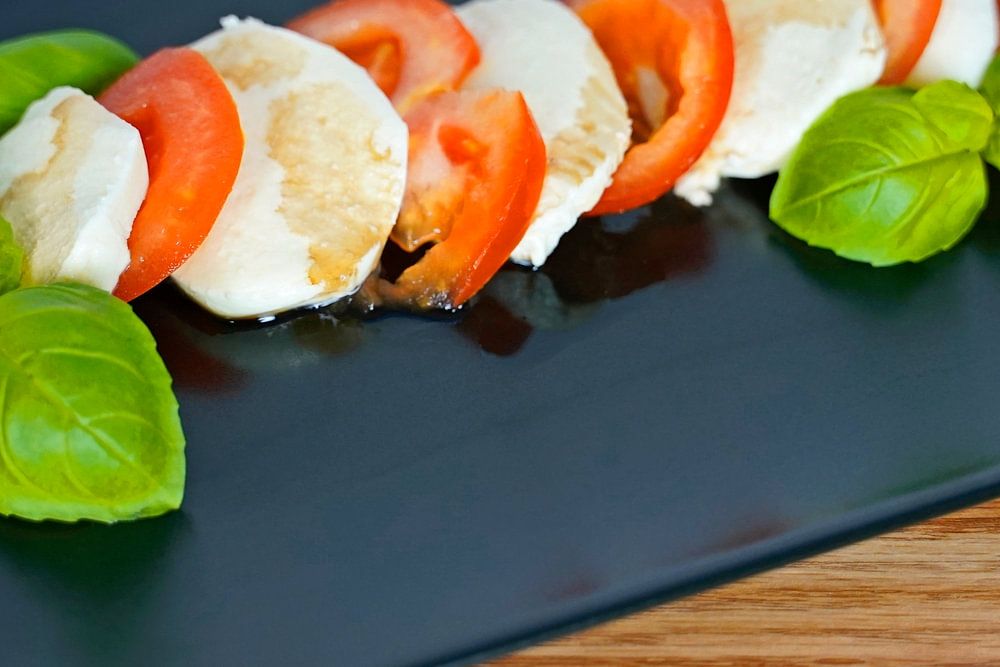 About "Tomato, basil and mozarella with balsamic cheese arranged on a black serving plate"