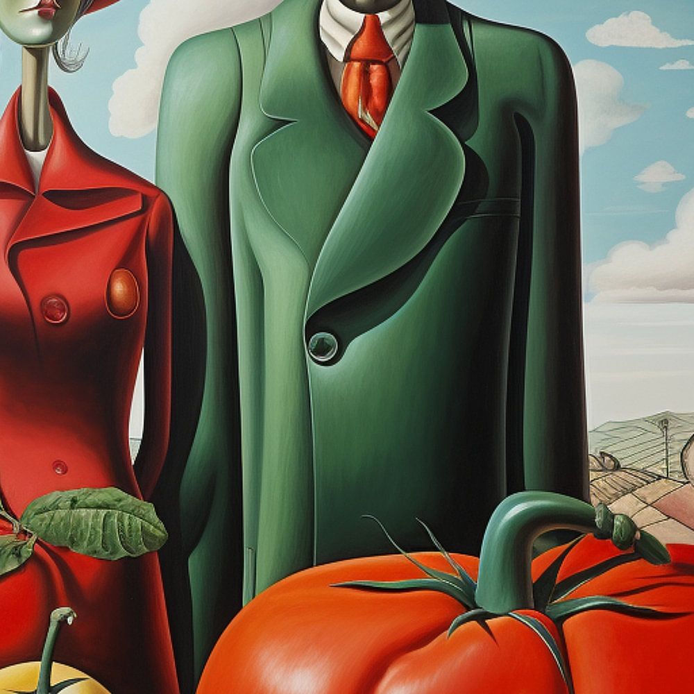 This painting shows a surreal couple in a wide, hilly landscape under a blue, cloudy sky. The figures have elongated faces with expressionless eyes and long, curved moustaches on the man. They wear elegant but unconventional clothing in shades of red and green, reminiscent of bygone eras. Oversized tomatoes lie in the foreground and the woman holds a yellow tomato in her hand. The picture plays with proportions and surreal elements that inspire reflection on identity and connection to nature.