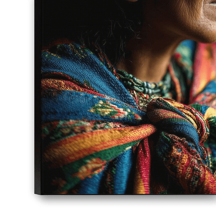 A native woman in profile, clad in richly coloured woven fabrics, looks determinedly into the distance. The light emphasises her quiet strength and dignity.