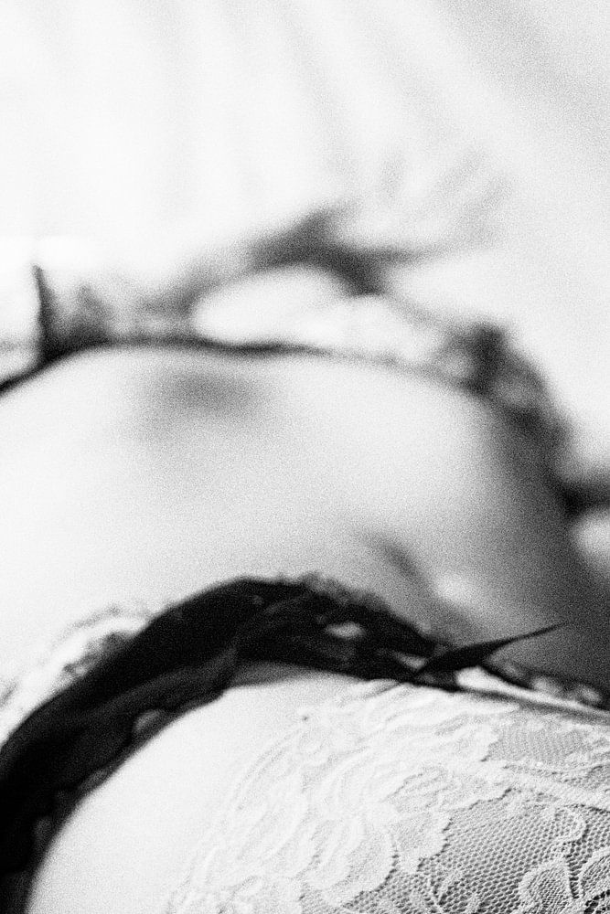 Close-up of a woman's body in black and white. Lace border and lingerie. Fine eroticism.