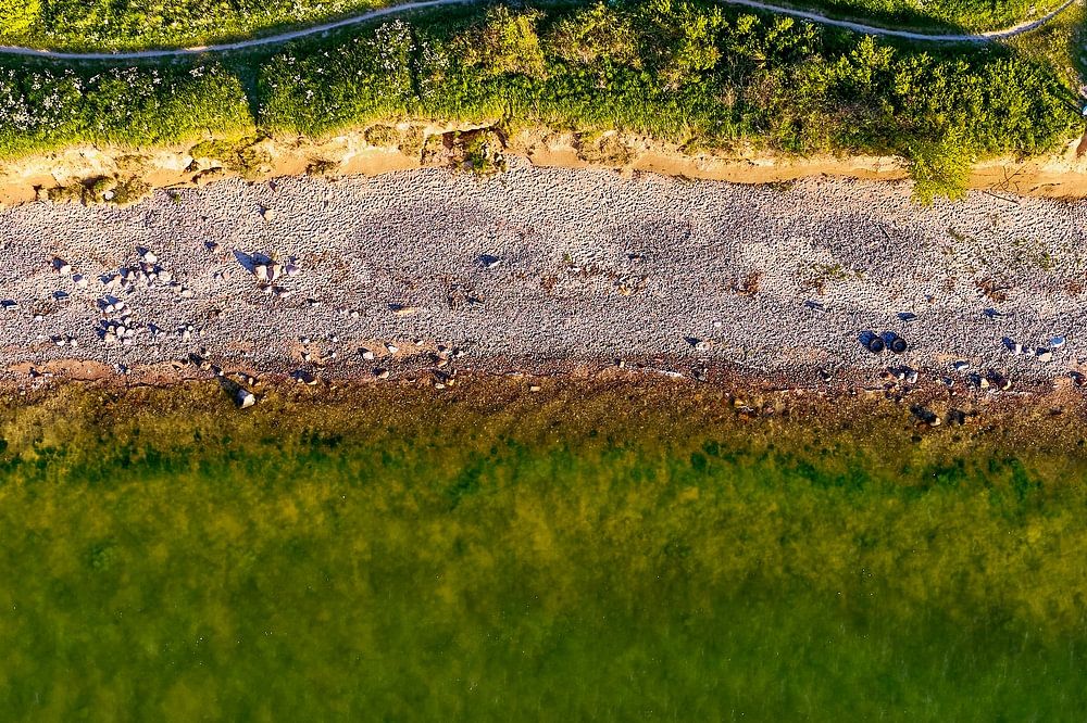 Topdown view of a coastline with cliffs, hiking trail and green nature as well as many stones on the beach by Stefan Dinse
