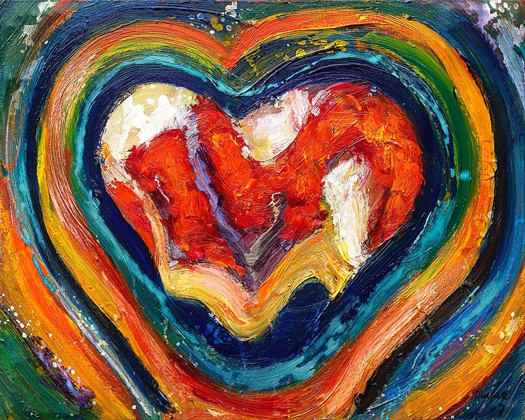 Expressive oil painting with a red heart surrounded by layers of blue, green and yellow. The paint is thick and visibly applied, with powerful colours. Colour and form are central to this direct, symbolic work.