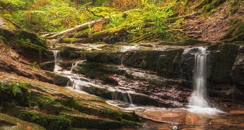 Wild stream in the Rhön on a rainy morning in September (autumn). A small waterfall meanders through the valley over picturesque rocks and stones.