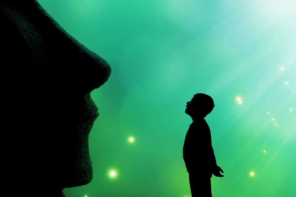 This dreamlike, mystical scene plays on contrasts of size, light and symbolism.