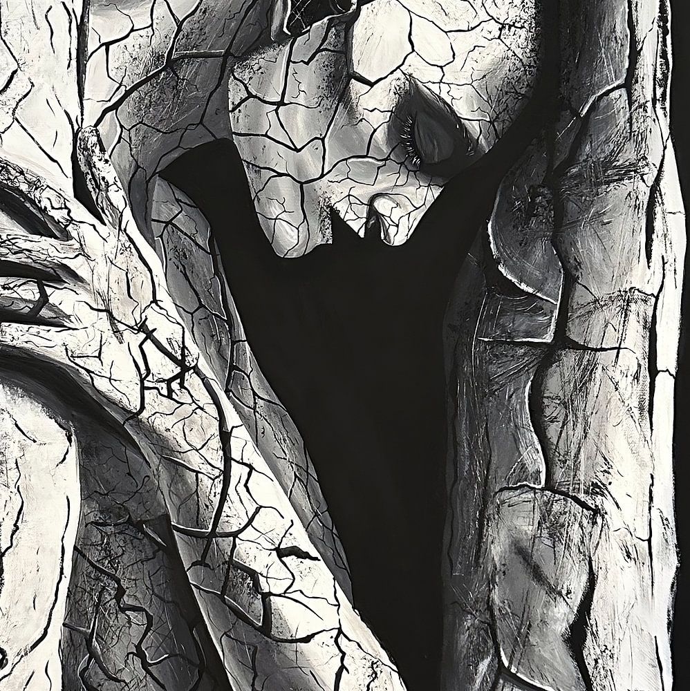 The monochrome colour palette in black and white reinforces the tension between stillness and movement, between destruction and renewal. The cracked surface of the body and the "trees" connects them visually and thematically. The question arises: Is the figure about to emerge from the earth, or is it returning to it?