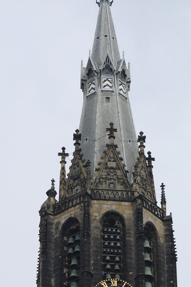 The blackened tower of the Nieuwe Kerk in Delt. A beautiful overcast sky provides a white canvas and makes the tower stand out.