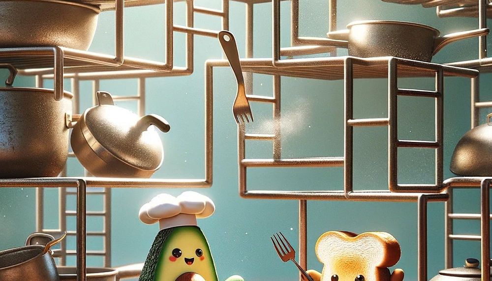 In this charming scene from the kitchen realm, Avocado and Toast can be seen playing an imaginative game of "tower to pots". As the sun streams through the window and casts a warm glow over the kitchen inventory, the pair have artfully assembled a tower of pots and pans. The avocado, with its proudly worn chef's hat, and the toast, with its tiny forked hands, stand as brave architects of their own little marvel. The comedic and affectionate portrayal of these two cartoon characters conveys an atmosphere full of cheerfulness and imagination and invites you to enjoy the small pleasures of life.