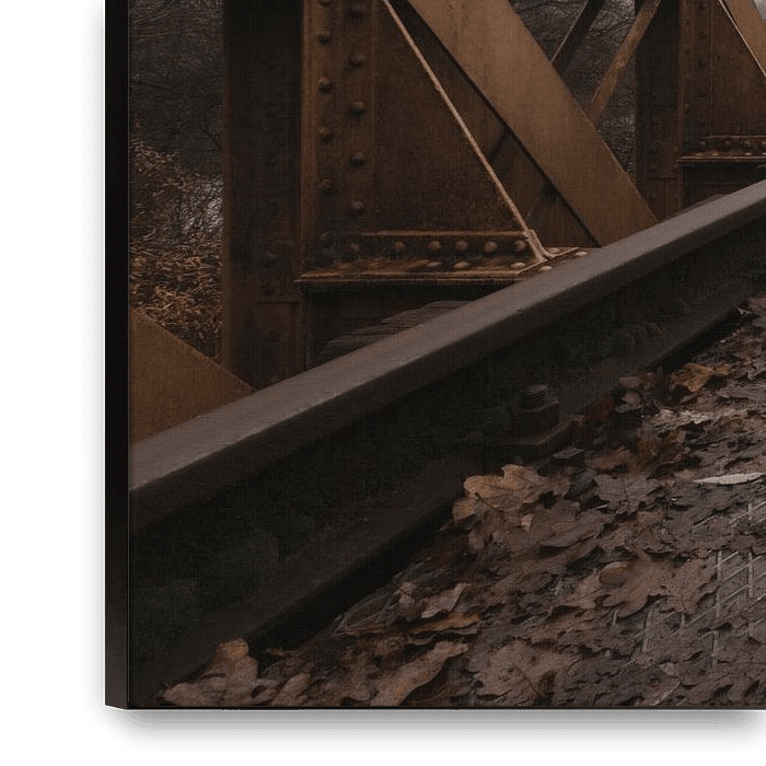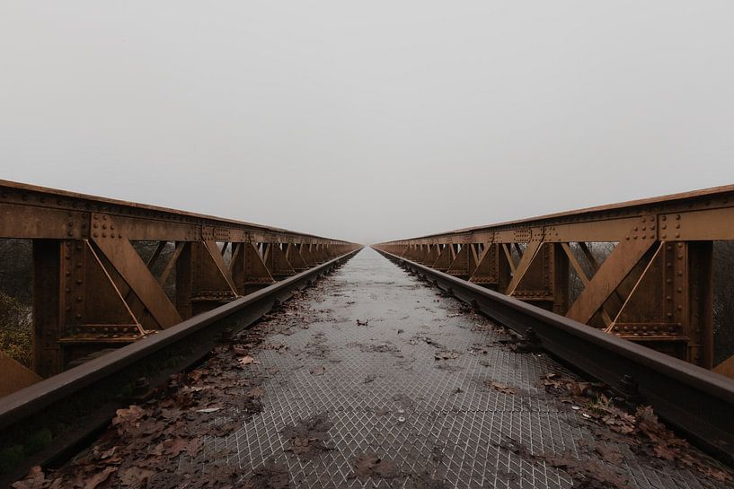This photo shows the Moerputten bridge in its most hushed form: a long, rusty railway bridge stretching into the misty distance. The bridge is constructed of riveted steel beams and trusses, with a metal grid platform as a walkway. The symmetrical composition draws the eye to the vanishing point, where the bridge seems to dissolve in…