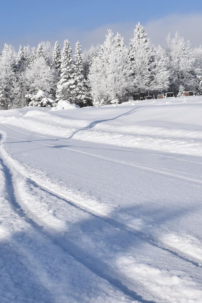 Tracks in the snow at the recreation ground in winter, Sainte-Apolline, Quebec, Canada