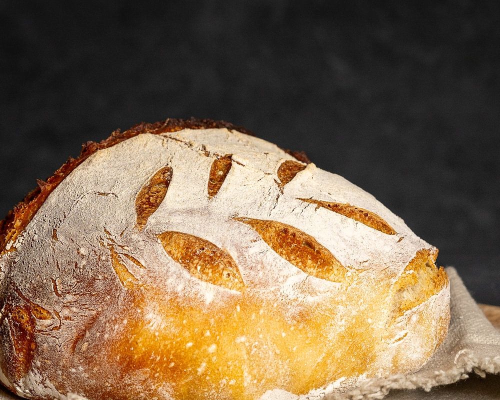 How delicious sourdough bread is. It is quite a bit of a chore to make but the upside is that it is also very photogenic. A homemade and traditional sourdough bread on a round board with napkin.